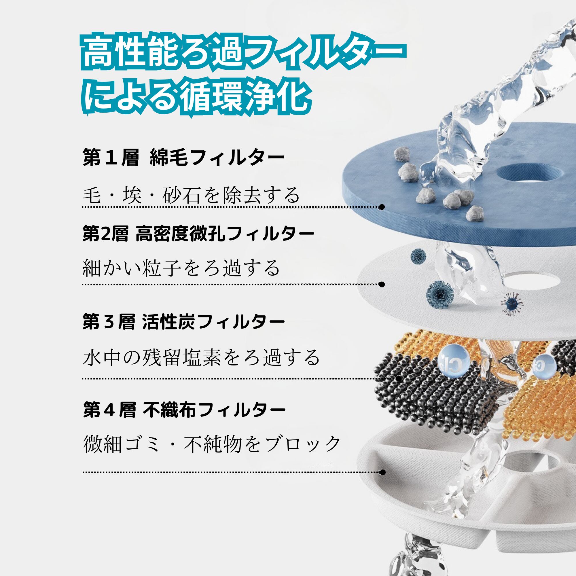 ✅高性能フィルター: 4層構造のフィルターシステムで水をクリーンに保ちます(フィルター1枚付属)