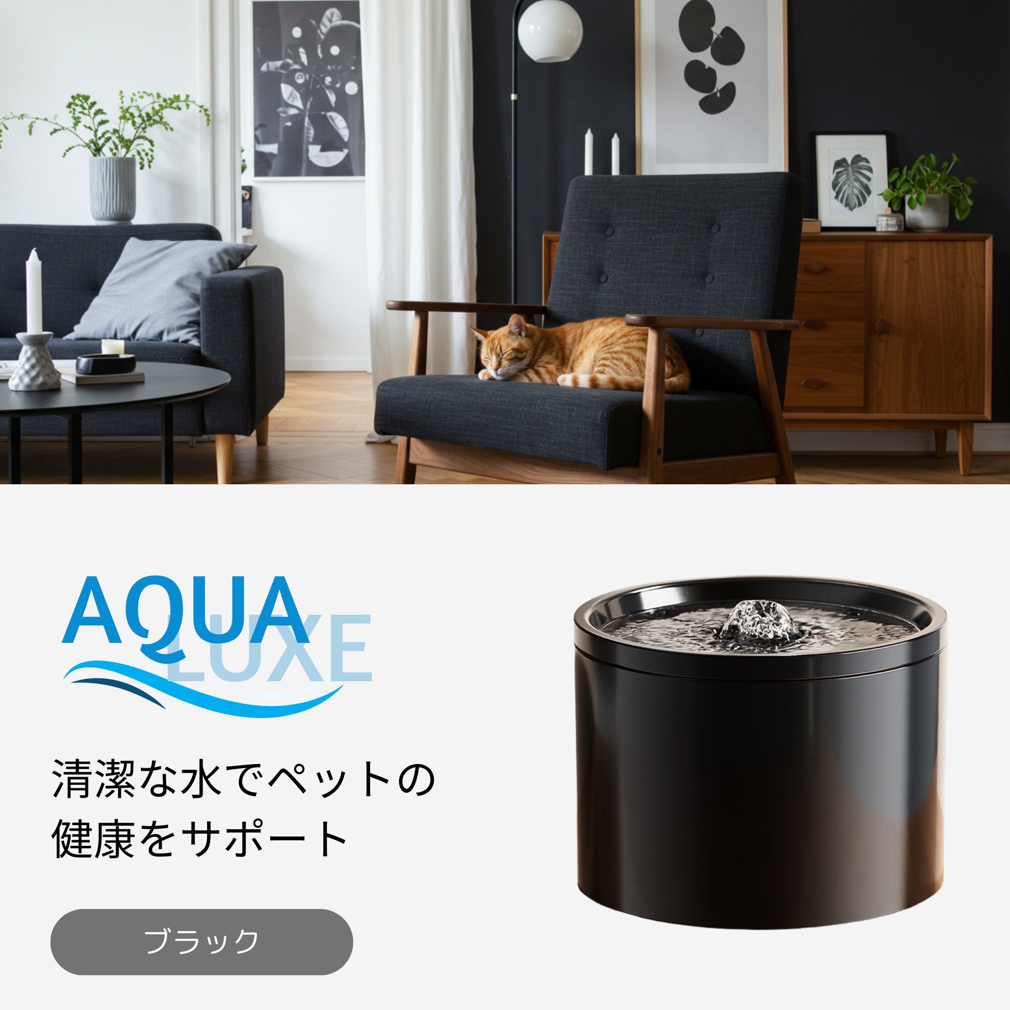 AQUA LUXE(アクアリュクス)は、"美しい水"と"美しい佇まい"を両立させた セラミック製の自動給水器です。 静音設計と滑らかな水流、丸みを帯びたミニマルなフォルムは、 猫にとっても、人にとってもストレスのない空間を叶えます。