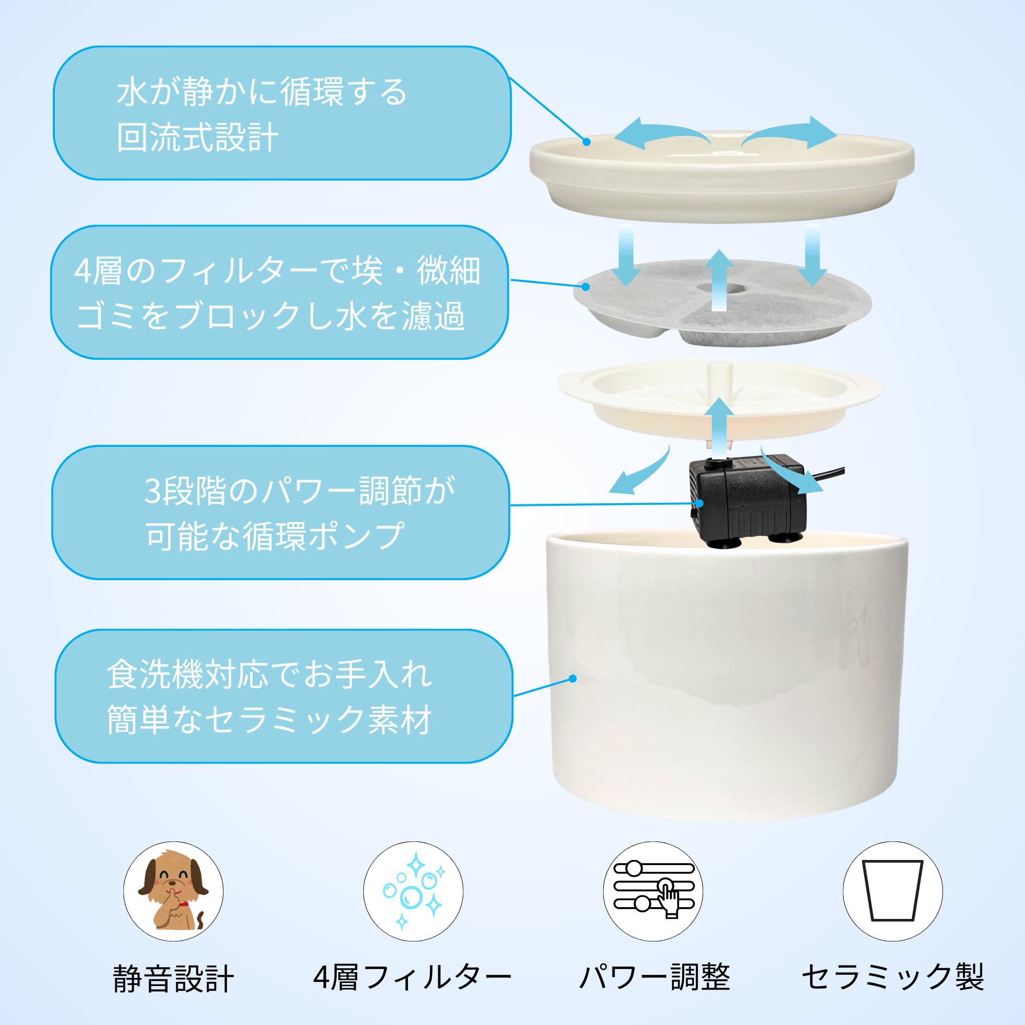 ✅高性能フィルター: 4層構造のフィルターシステムで水をクリーンに保ちます(フィルター1枚付属)