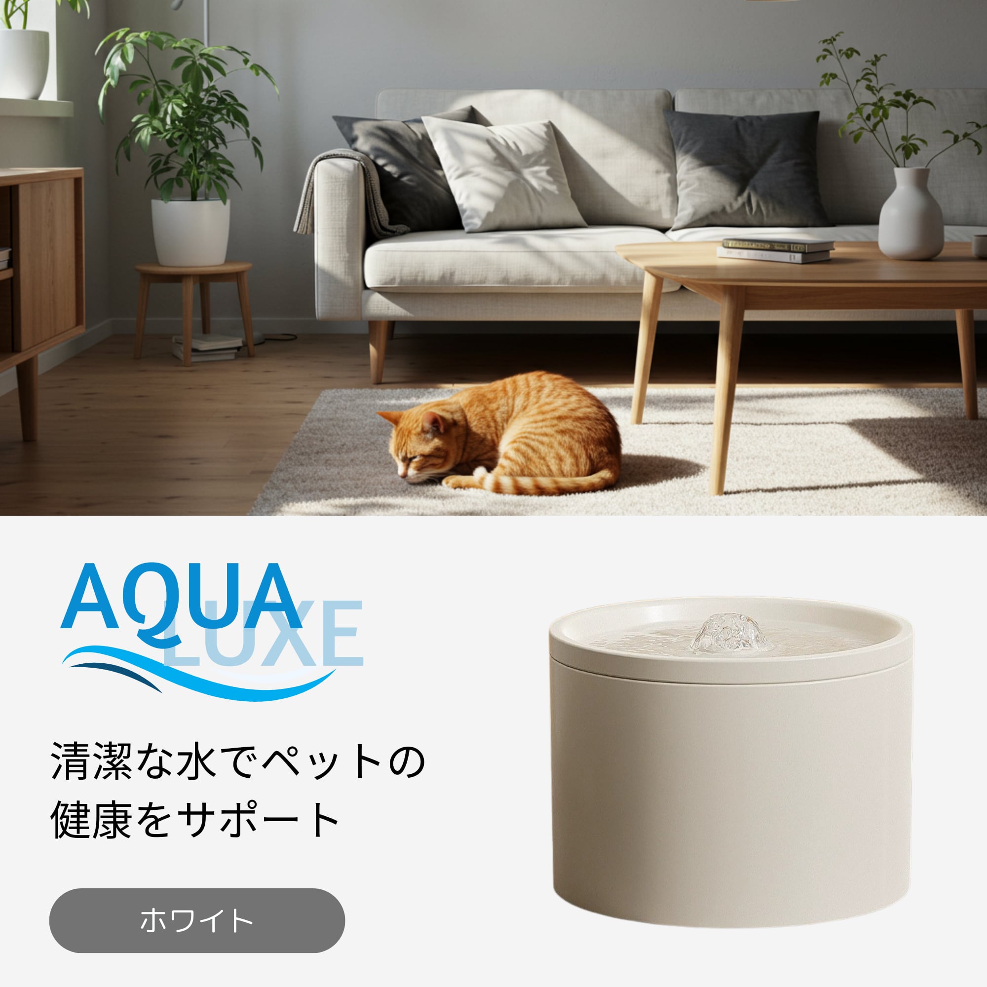 AQUA LUXE(アクアリュクス)は、"美しい水"と"美しい佇まい"を両立させた セラミック製の自動給水器です。 静音設計と滑らかな水流、丸みを帯びたミニマルなフォルムは、 猫にとっても、人にとってもストレスのない空間を叶えます。