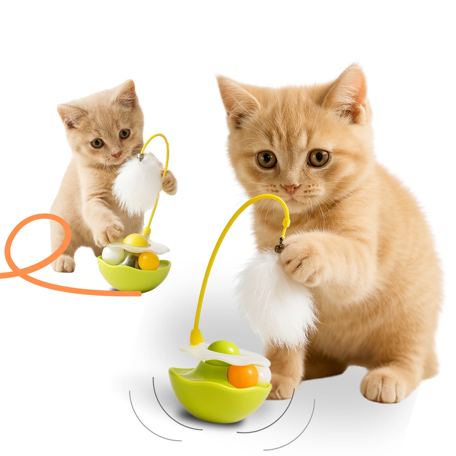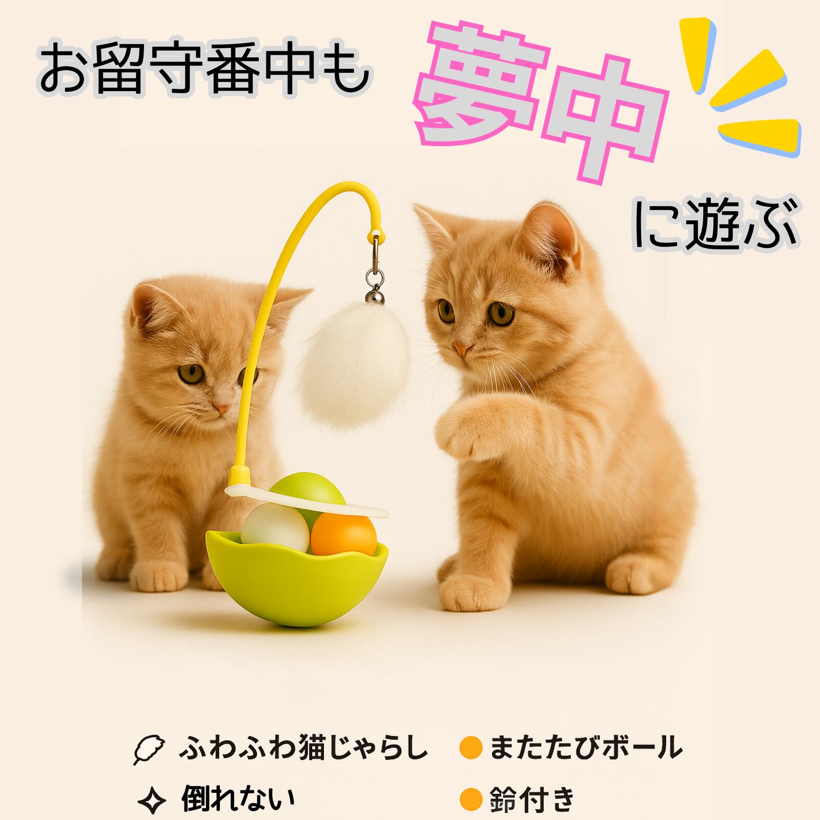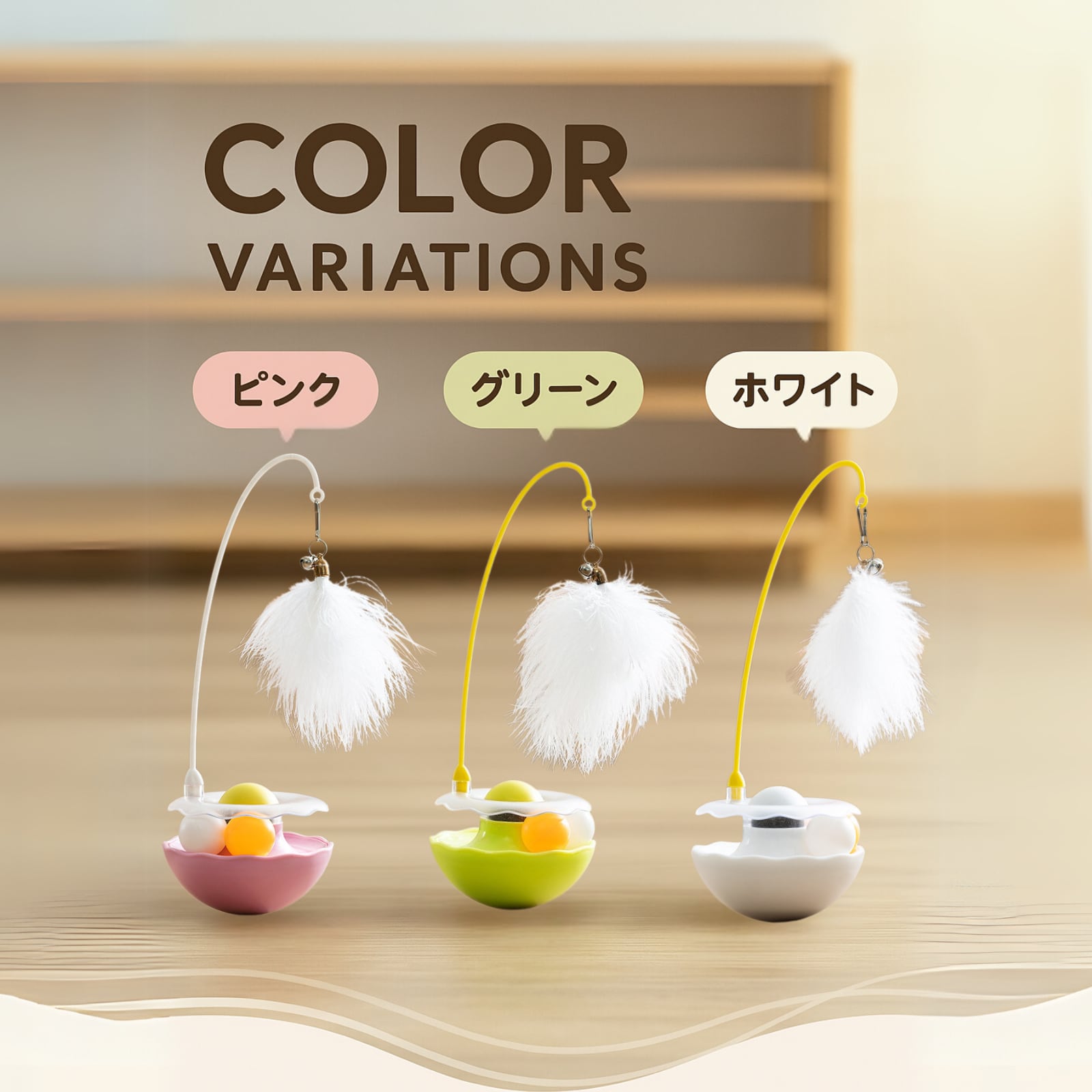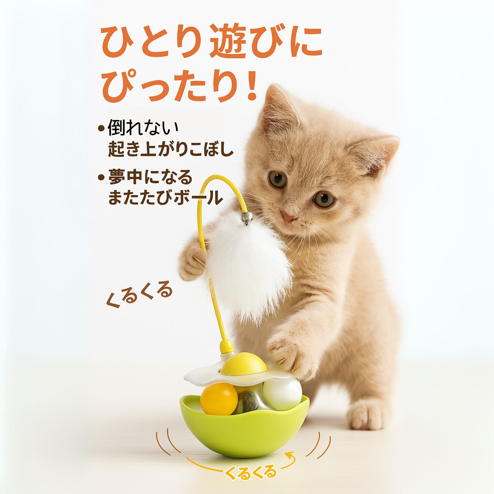ボールと羽根が回転しながら猫の興味を引きつける、ひとり遊びのおもちゃです。 本体は起き上がりこぼし設計で転倒せず何度でも起き上がります。留守番中の運動不足やストレス解消にぴったりです。